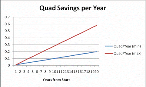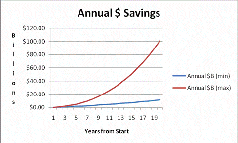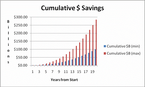 The ENERGY dollar savings would be 16 to 100 Billion dollars per year, yes with a B, after 19 years and 10% of installation.